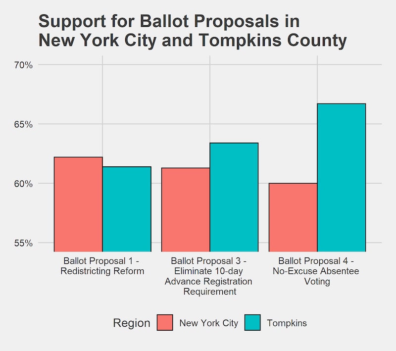 New York Democrats were left reeling from the November failure of three ballot measures that would have expanded voting access in the state and reformed redistricting practices. But Tompkins County, home of Ithaca, presents a worthwhile case study for the party, which hopes to resurrect the ballot measures in the next statewide election. In Tompkins, all three measures passed with over 60 percent of the vote, a far higher rate than the rest of the state.