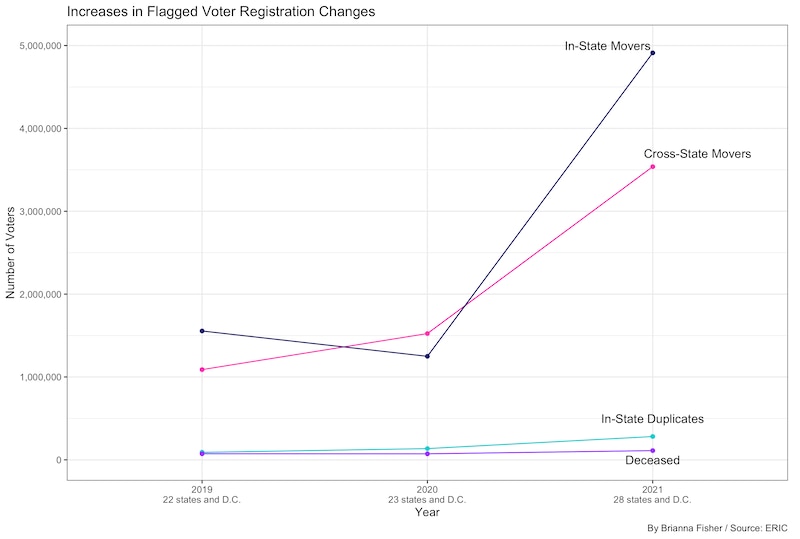 You’ll see a massive jump in the number of in-state movers from 2020 to 2021. There are a few possible reasons. Texas and Florida — both gigantic states — joined just before that period, making the total number of voters whose registrations are examined in ERIC shoot up significantly. There are about 30 million registered voters across both states. Florida’s high number of flagged records, however, is a bit surprising given that the state implemented online voter registration in 2017, which generally results in voters more proactively reporting address changes. (This is the lowest lift for voters to update their address, which means they actually tend to do it, and also means that states tend to have more robust movement data than states that don’t have online voter registration.) Also, people just moved a lot in 2020 as the pandemic upended lives all over. Mass, unpredictable changes like this demonstrate the need for robust voter-roll matching. While ERIC isn’t capable of figuring out why someone moved or why they are on two rolls, it can simply highlight the fact of it for states and counties to handle as state law requires.