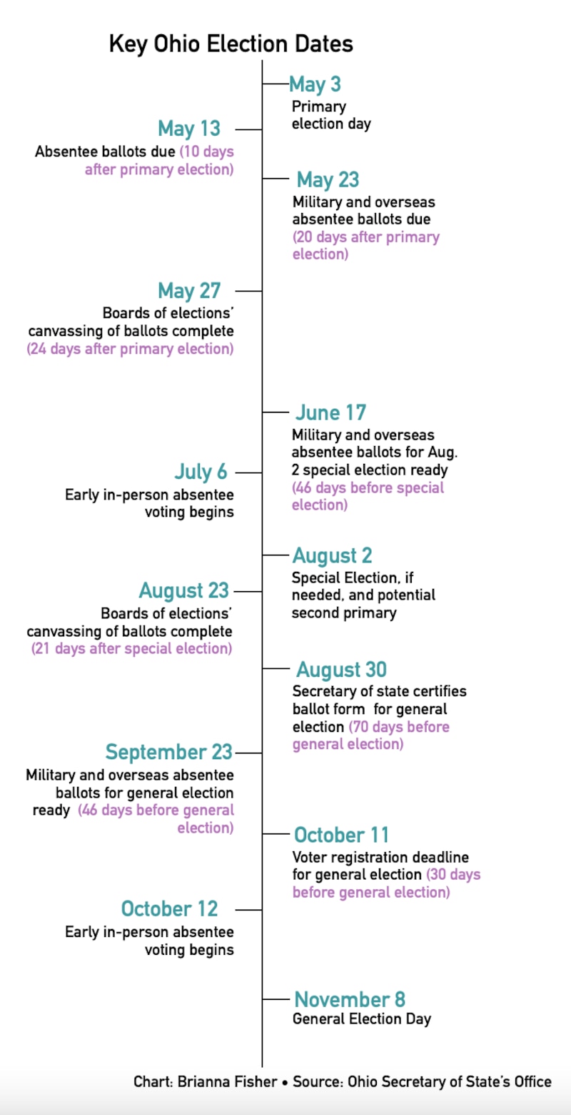 If the next election is Aug. 2, those military and overseas ballots must be ready for use by June 17 — just a few weeks after the deadline to finalize the May 3 election results. Early voting — which begins 28 days before the election in Ohio — would start July 6.