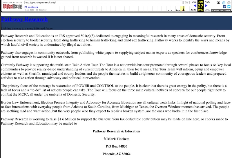 The nonprofit’s purpose has changed over time. At first, it was called Pathway Research and Education and its website said the focus was research on energy, education, tax, infrastructure policy, and land management. An archived version of the website from June to September 2022, which no longer exists, says it was trying to raise $1.6 million to support what it calls a multi-state national bus tour “to provide reality-based understanding of current threats to America in their local areas.” It told visitors to send checks directly to Finchem’s PO box in Phoenix.