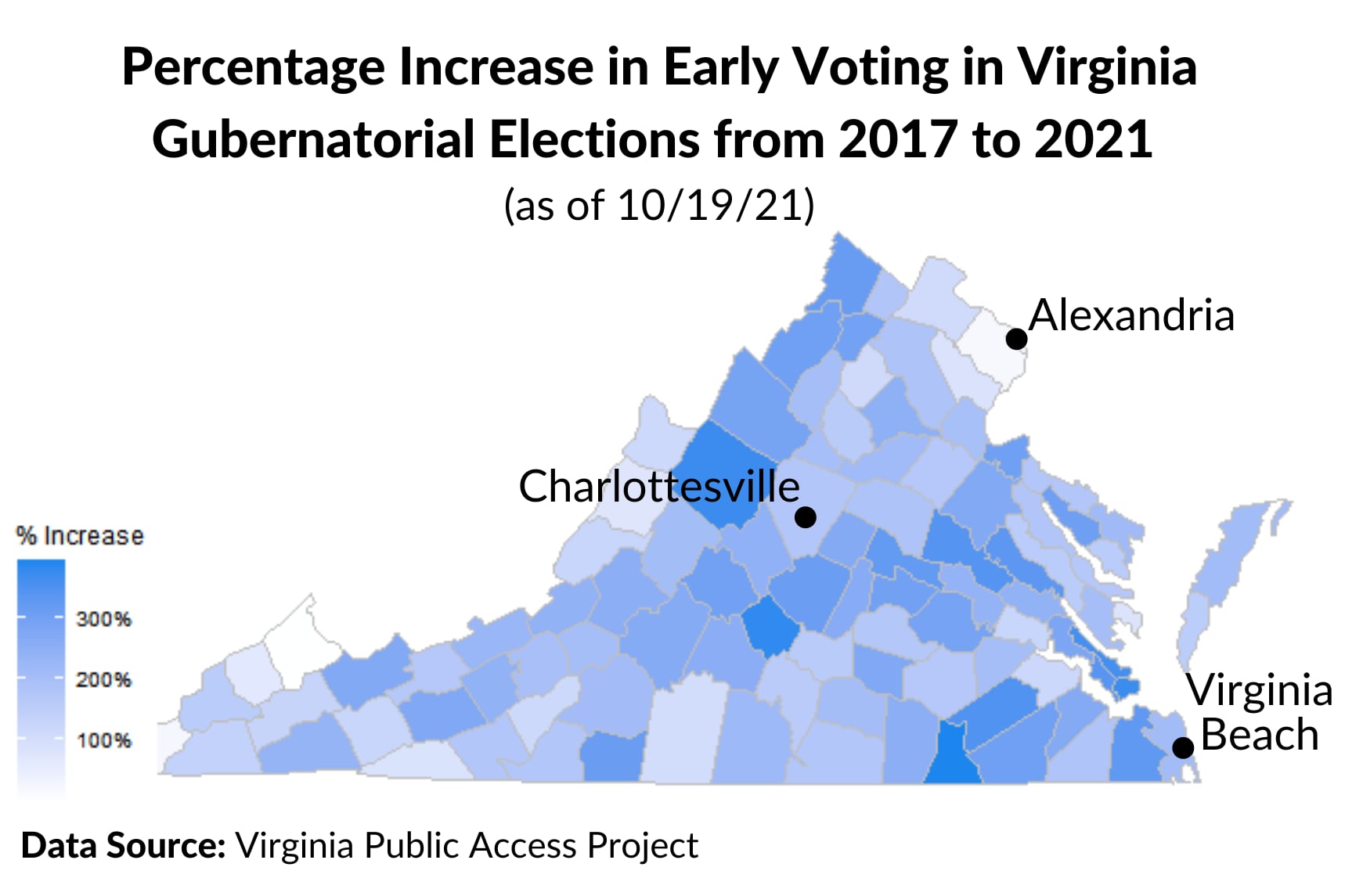So why are we seeing these huge increases? Many experts are pointing to the pandemic as having boosted interest in early voting since 2020. In addition, Virginia recently introduced no-excuse absentee voting and eliminated its ID requirements for voting, all of which appear to be driving these huge increases.