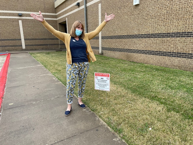 She was assigned to O’Banion Middle School in Garland — by happenstance, the middle school she attended. “It’s weird that I was doing band practice in here when I was 11 and now I’m working the polls,” she said (she played the drums). “I love it though – how fun is this?” She also married my father at the church immediately next door to the school.