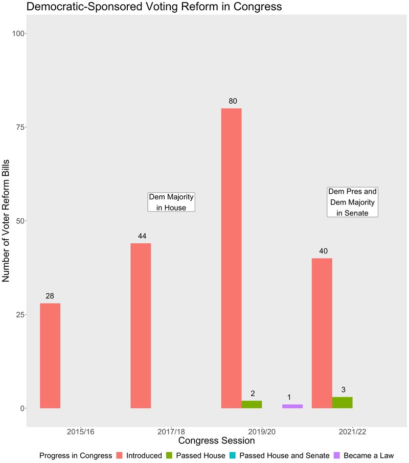 Even as Democrats increased their power in chambers of Congress and won the presidency, Democrats have made little progress in the space. In both the 2015-16 and 2017-18 sessions, no voting reform bills passed either the House or Senate. The 2019-20 session had the most success with two bills passing the House and one becoming law (S. 1321 Defending the Integrity of Voting Systems Act). In the 2021–22 session so far, three bills have passed the House only. Political observers’ theories on this track record range from GOP obstructionism to lack of Democratic unity to ineffective White House leadership to unwillingness of lawmakers to limit the scope of their bills.