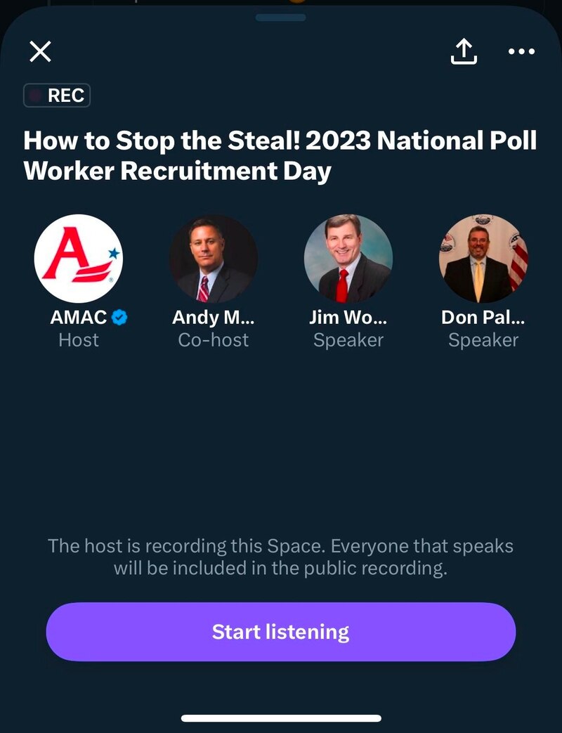 This week, for example, Donald Palmer, a Republican commissioner with the U.S. Election Assistance Commission, appointed by Trump, participated in a Twitter Spaces event aimed at poll worker recruitment that, for some reason, was titled “How to Stop the Steal.” So I emailed the agency with a straightforward question: “Does Commissioner Donald Palmer believe the 2020 election was stolen?”