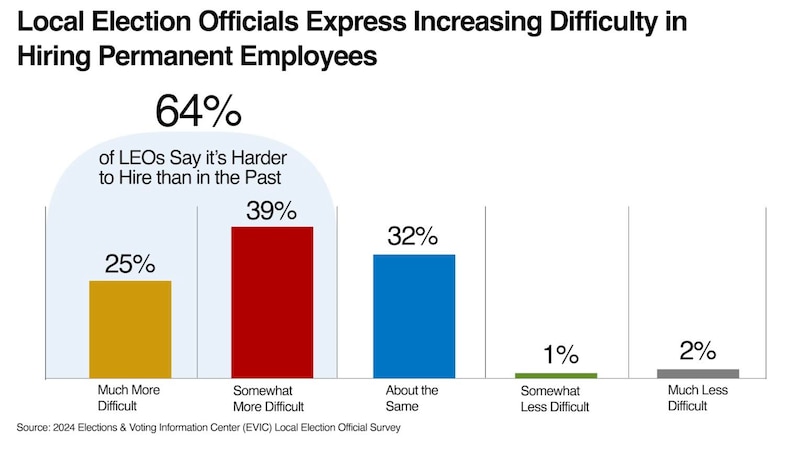 Critically, more than 40% of election administrators say that job applicants have little to no experience in elections, and more than a quarter say that applicants lack the practical skills to do the work. That isn’t surprising in such a niche sector.