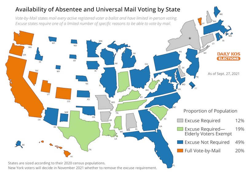 This week I bring you a map I discovered from Daily Kos, showing the current status of vote by mail availability, delineated geographically and as proportions of the U.S. population: