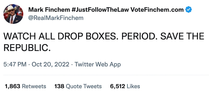 In June, Lake ran a poll asking people if they would be “willing to take a shift watching a drop box to catch potential Ballot Mules in the 2022 Election.” In July, Lake tweeted out a photo of a drop box in Coconino County and said “Potential Mules beware: we are watching drop boxes throughout the state. Smile… you might be on camera!” On Oct. 20, after voter intimidation complaints began to roll in, Finchem tweeted, “WATCH ALL DROP BOXES. PERIOD. SAVE THE REPUBLIC.”