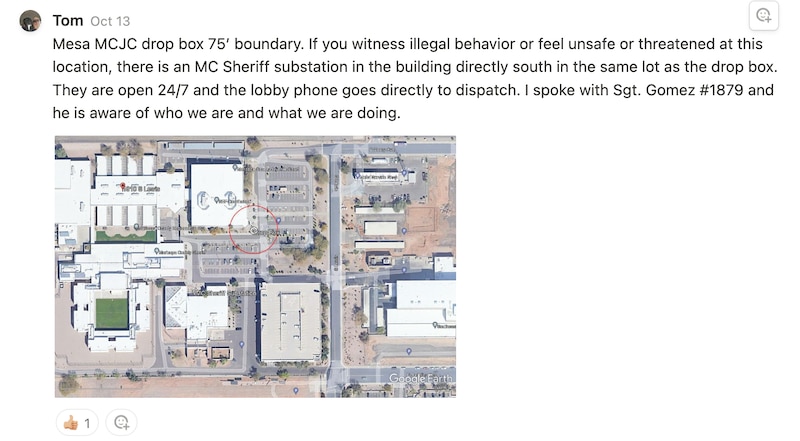 One of the most active volunteers on the site, who goes by “Tom,” has been organizing meet-ups at the outdoor Mesa drop box, near Maricopa County Juvenile Court, a location linked to three of the voter intimidation complaints that have been referred.