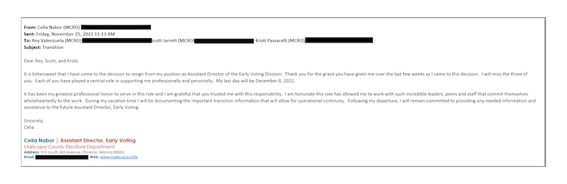Nabor gave her written resignation on Nov. 25 and her last day was Dec. 9. The first time Blehm asked to speak to Nabor was on Dec. 20, when he approached a county attorney, Joseph La Rue, during ballot inspection for Lake’s initial election contest trial. Blehm followed up in writing in mid-January, according to emails Blehm sent to the county as well as La Rue’s account of the requests.