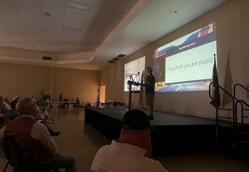Many were there to see Tina Peters, the former Mesa County Colorado clerk who was indicted last year on felony and misdemeanor charges related to election equipment tampering after she allowed unauthorized people break into her county’s election system in hopes of finding evidence of fraud. As she walked in, Peters received a standing ovation from the crowd of mostly senior citizens. The crowd fell silent when she took the stage, listening as she explained why the voting machines and government officials — including those who arrested her — could not be trusted. She also denied any wrongdoing on her part related to criminal charges against her, and provided no evidence that Kerr County’s elections were flawed.