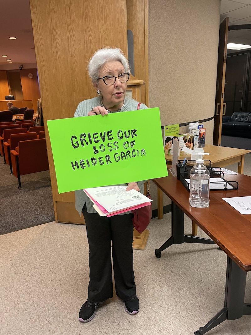 “He’d done a superb job. All I know is that we had somebody who was great and now we don’t,” said Jackee Cox, a resident of Fort Worth who on Tuesday walked into the meeting holding a sign that read “GRIEVE OUR LOSS OF HEIDER GARCIA.”